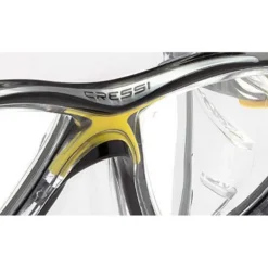 The headband uses the exclusive patented Cressi system of double injection of an elastomer on a rigid element and allows the buckles of the strap to be mounted not on the skirt structure, as done by our competitors, but on an indestructible elastic element that tilts on a vertical plane and can be completely bent sideways on a 180° curve.
