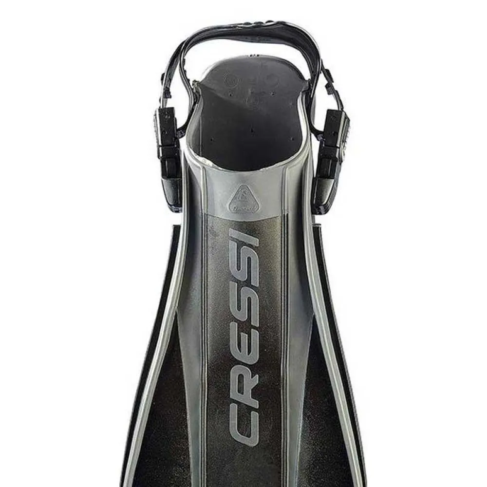 A classic in the Cressi range, this has been on the market for many years and has a huge number of appreciators in every corner of the planet. The fin is made with a skilful combination of a strong copolymer and a soft elastomer, the latter used for the foot pocket, for the side stringers and for some inserts. The blade originates from the upper part of the foot pocket, with a 20% increase in useful surface area compared to a traditional fin of the same length. The foot pocket is computer designed and offers great comfort; it guarantees excellent transmission of the leg-fin thrust. The Frog is heavier than the more recently designed equivalent Cressi models. It is this feature that makes it agreeable to whoever uses very thick suits or watertight suits. Anyone who works underwater will appreciate this fin a great deal because it is strong and comfortable, very popular also in diving schools and excellent for rental.