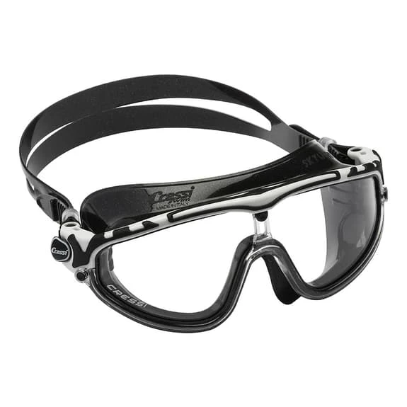 The Cressi Skylight swimming goggles with clear lenses have a polycarbonate frame with a minimum thickness to avoid annoying contact points with the face and a reinforced central bridge to avoid loss of flatness of the lenses. The anti-fog and anti-UV treated polycarbonate lenses are slightly curved at the sides to avoid optical aberrations common in curved lenses underwater.